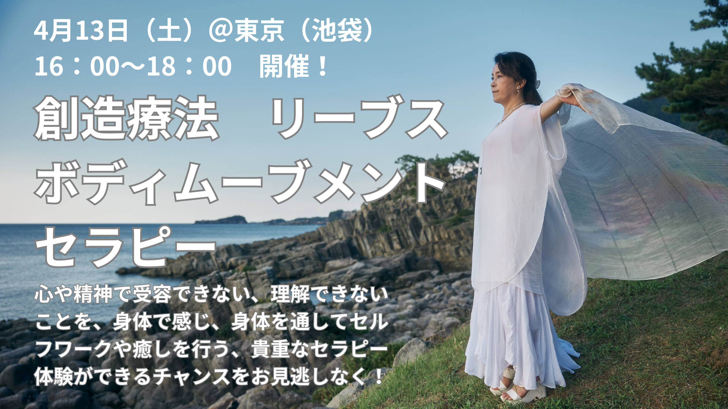 4月13日(土)16:30~18:00、東京会場(池袋)で開催する「創造療法 リーブス・ボディムーブメントセラピー(30名限定)」のご案内です!