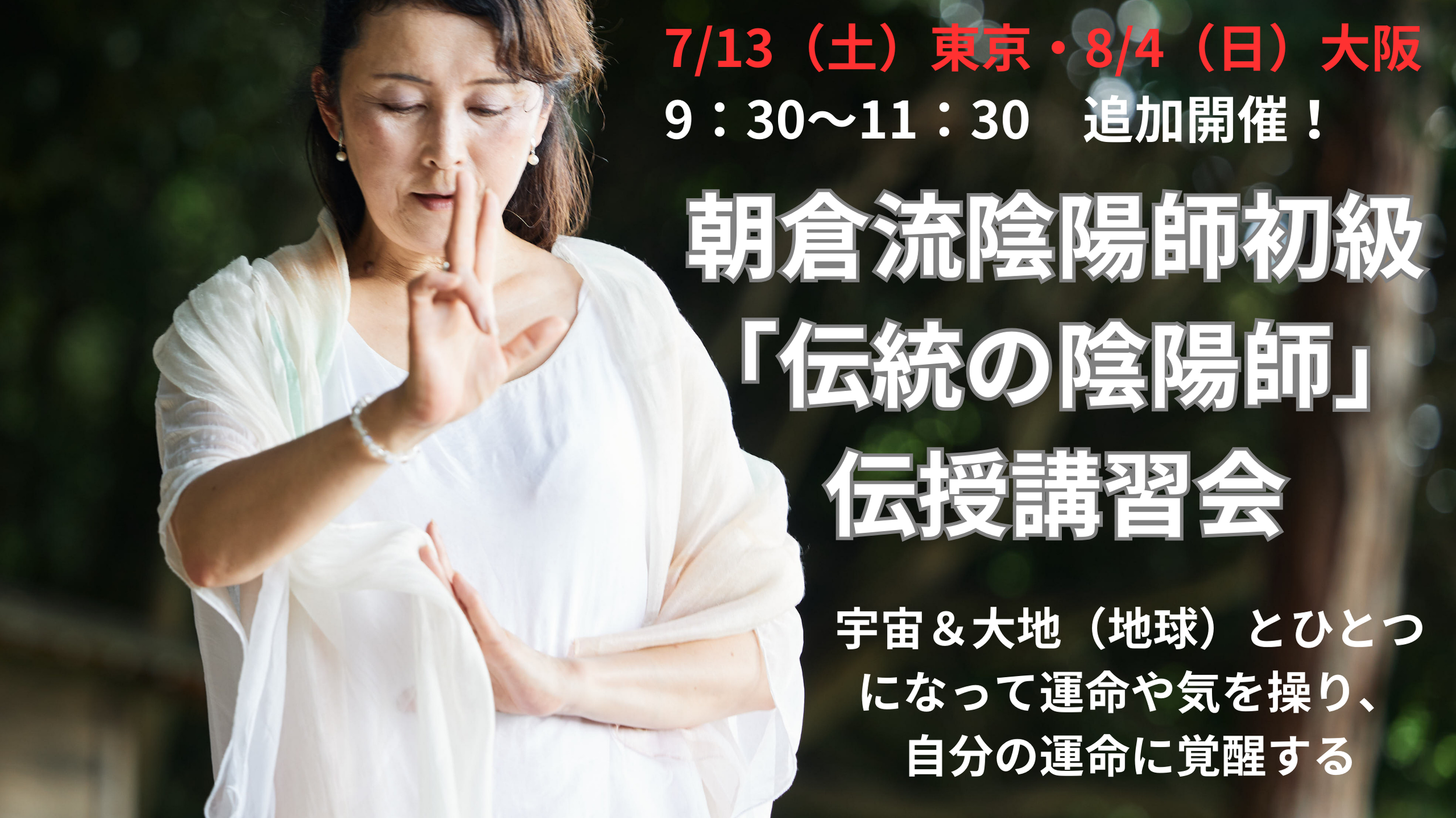 7月13日(土)東京、そして8月4日(日)大阪にて、陰陽師初級「伝統の陰陽師」の伝授講習会を、創始者朝倉裕美子師範の指導で行わせていただきます。