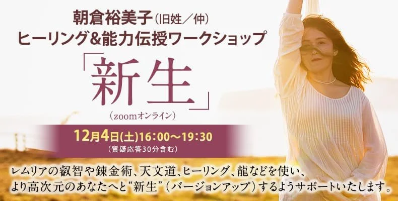 そして、来たる12月4日(土)、一般向け公開ワークショップとしては約14年ぶりとなる、朝倉裕美子ヒーリング&能力伝授オンラインワークショップ「新生」を、開催させていただくこととなりました。