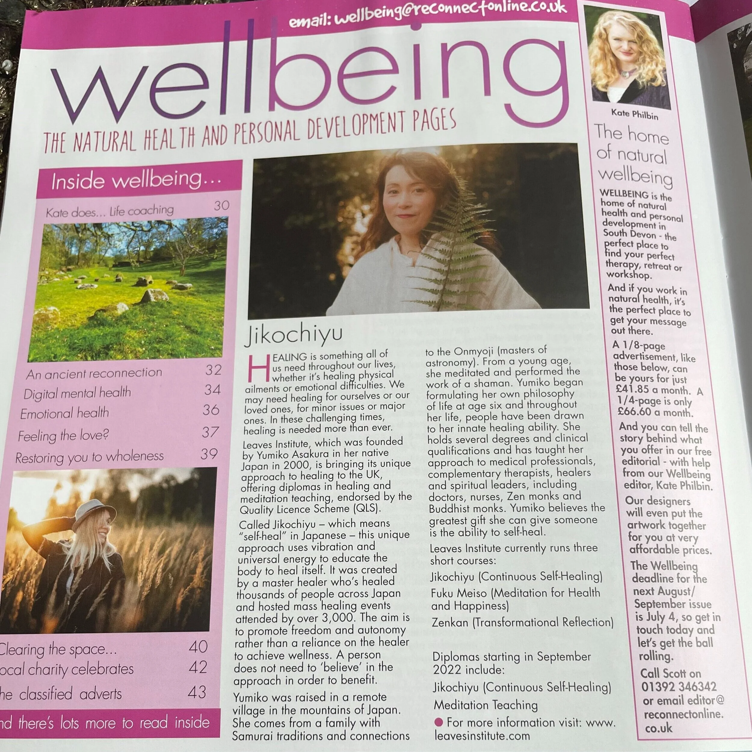 英国で人気のLOHAS&健康志向系フリーペーパーの『リコネクトマガジンissue72』で、ウェルビーイング系記事を専門とするライターのKate Philbineさんが、朝倉裕美子のプロフィールや「自己治癒ヒーリング」について紹介記事を書いてくださいました!